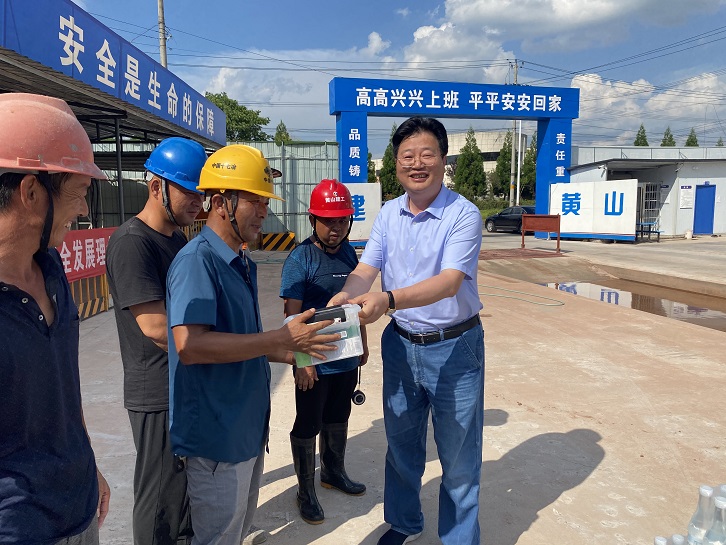 在黃山市南部城鎮(zhèn)群水務(wù)調(diào)度中心項(xiàng)目、黃山生豬定點(diǎn)屠宰加工及配套設(shè)施項(xiàng)目及配套冷鏈項(xiàng)目施工現(xiàn)場(chǎng),城投集團(tuán)總裁黃世穩(wěn)、黨委副書(shū)記汪蓉、副總裁朱愛(ài)民等一行將慰問(wèn)品送到一線職工手中,并和大家親切交談,細(xì)致了解大家的生活工作情況,總裁黃世穩(wěn)叮囑要注意勞逸結(jié)合,合理安排作息時(shí)間,做好防暑降溫工作,確保實(shí)現(xiàn)安全生產(chǎn)。